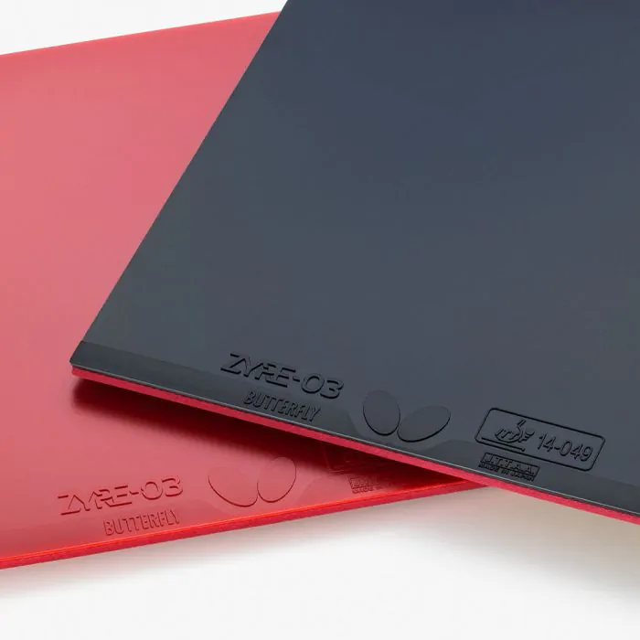 Zyre se sastoji od “Ricosheet” gornjeg sloja s gustim, niskim pimplesima i izuzetno debelom spužvom. Osim ove prepoznatljive strukture, ova guma ima gornji sloj s pojačanom otpornošću na habanje, izvrsnim osjećajem zadržavanja loptice i tvrđom Spring Sponge X spužvom. Primjenom pimple koda br. 303, koji izvlači snagu kroz rotaciju, Zyre 03 omogućuje udarce koji prodiru duboko na protivničku stranu stola s izraženom zakrivljenom putanjom. Preporučuje se igračima koji žele dominirati u izmjenama snažnim udarcima bogatim rotacijom.
